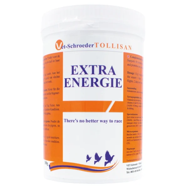 Nova i revolucionarna priprema za kondiciju. Sastav minerala, aktivnog gvožđa, vitamina, amino kiselina, karnitina i elektrolita. Koristi se protiv gubitka opšte kondicije i za povećanje performansi letenja. Nakon dodavanja Extra Energy tokom takmičarske sezone, golubovi odmah bolje treniraju i lete. Kod mnogih vrhunskih uzgajivača, ovaj proizvod je dobro čuvana tajna za korišćenje na važnim letovima.